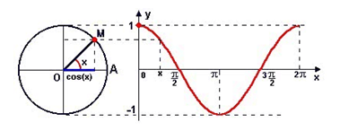 Do mesmo modo, para cada ângulo x (que é a medida de um arco na circunferência trigonométrica), temos um ponto M, que é o final desse arco que possui a abscissa igual ao cosseno do ângulo x. Se representássemos vários valores de ângulo de arcos e as abscissas dos seus respectivos pontos em um gráfico, teríamos: