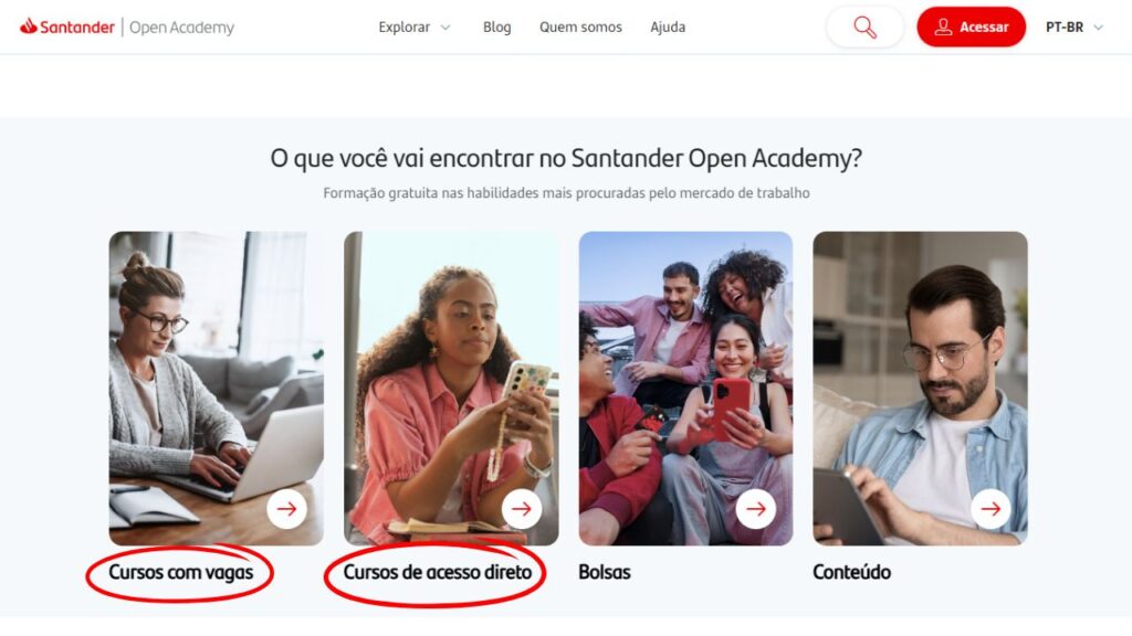 Para explorar os cursos gratuitos da Santander Open Academy, clique em “Cursos de acesso direto” ou “Cursos com vagas“.